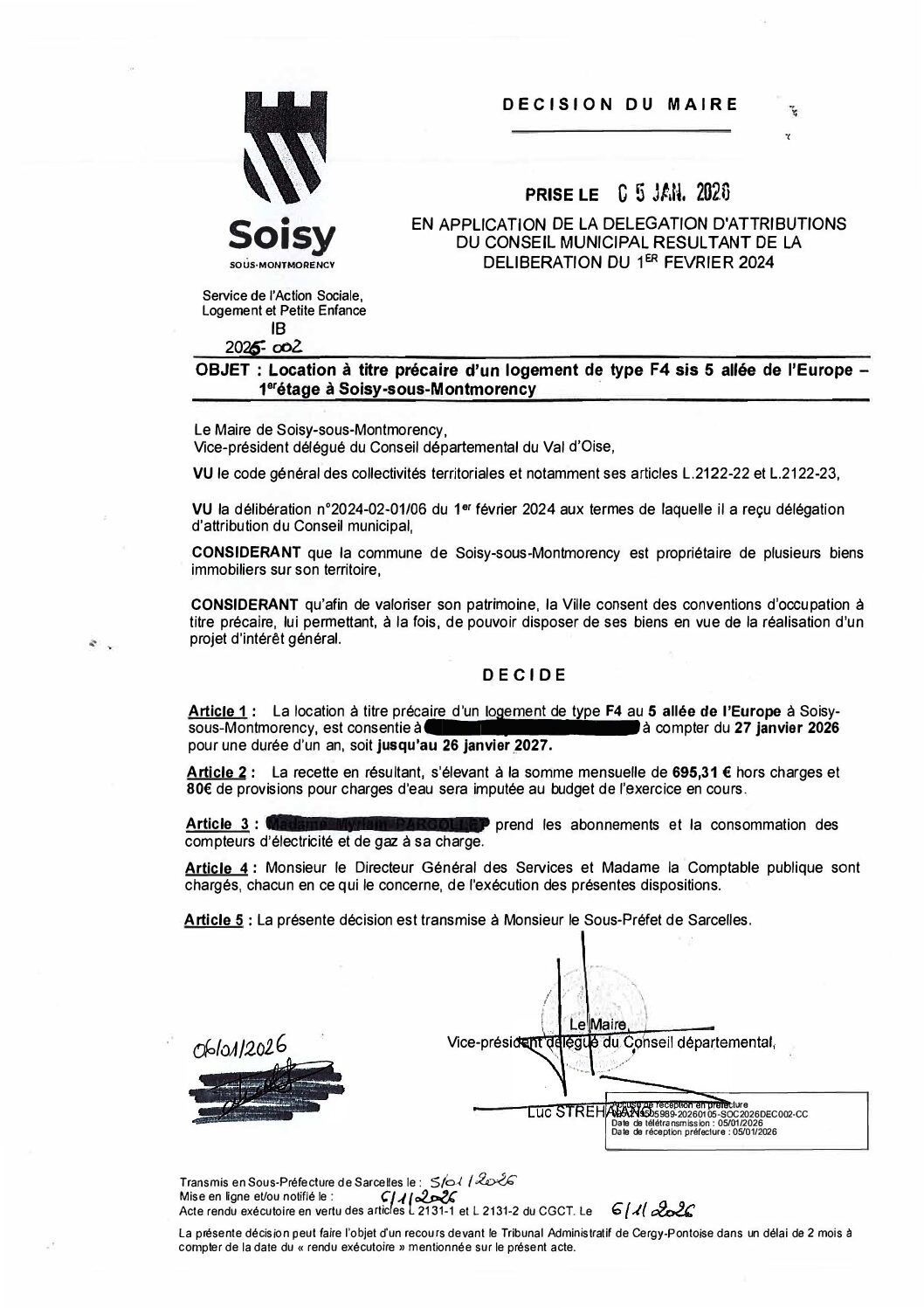 Décision 2026 – 002 : Location à titre précaire d'un logement de type F4 sis 5 allée de l'Europe – 1er etage à Soisy-sous-Montmorency