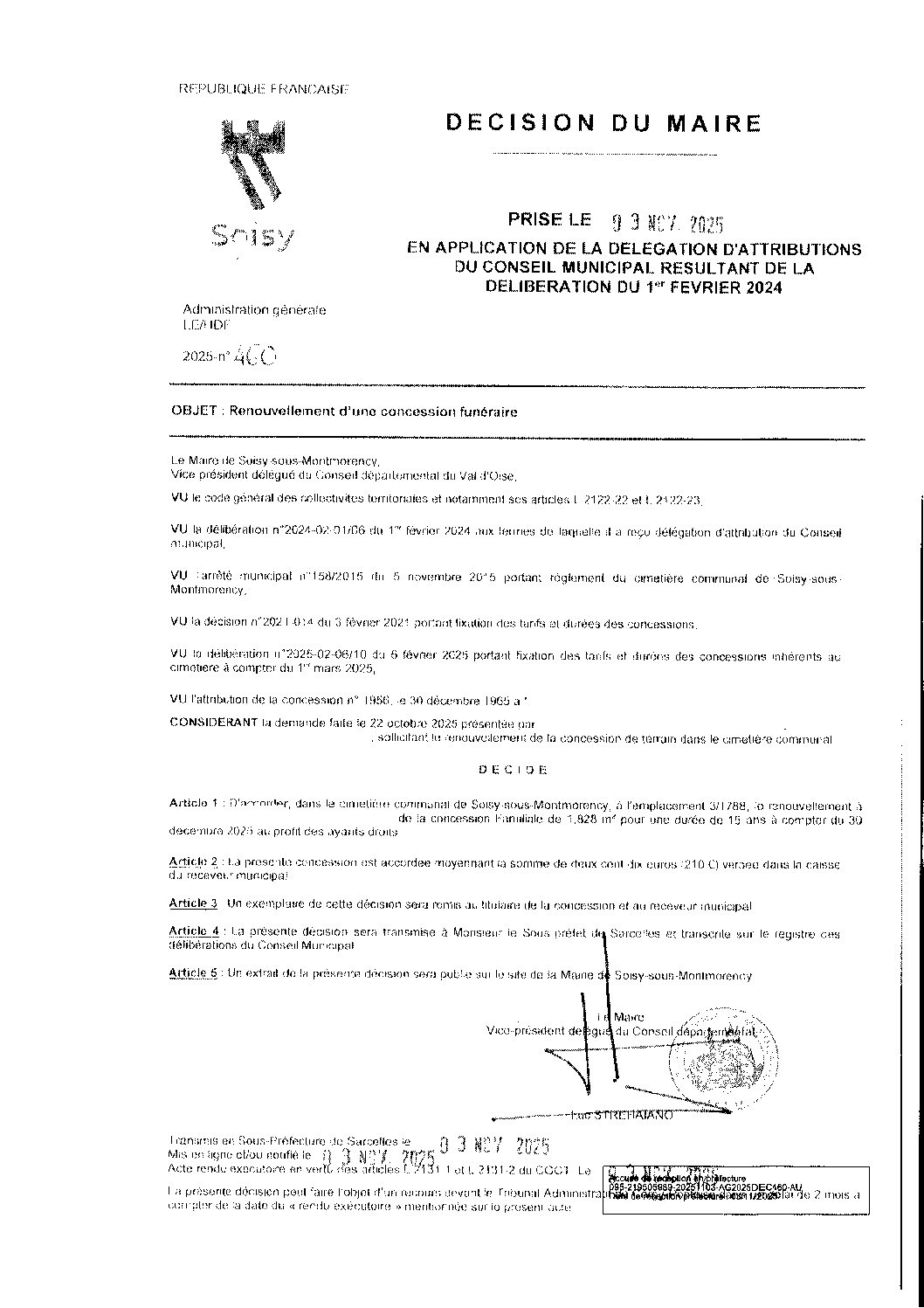 Décision 2025-401 : Renouvellement d'une concession funéraire