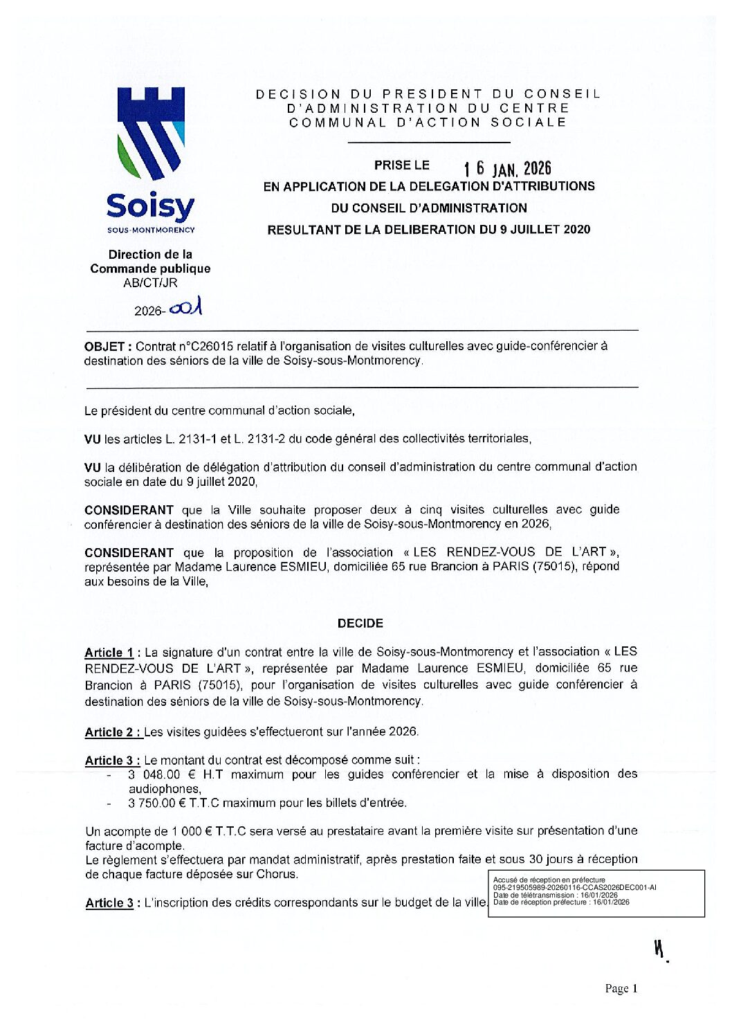 Décision 2026-001 : Contrat n°C26015 relatif à l'organisation de visites culturelles avec guide-conférencier à destination des séniors de la ville de Soisy-sous-Montmorency.