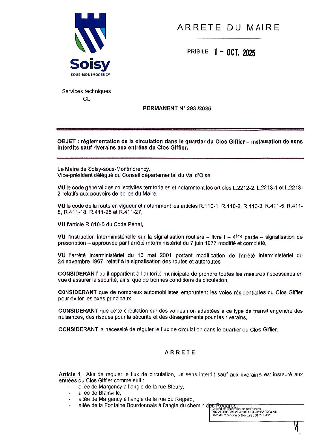 Arrêté 293/2025 : réglementatlon de la clrculatlon dans le quartier du Clos Glffler – Instauration de sens Interdits sauf riverains aux entrées du Clos Glffler