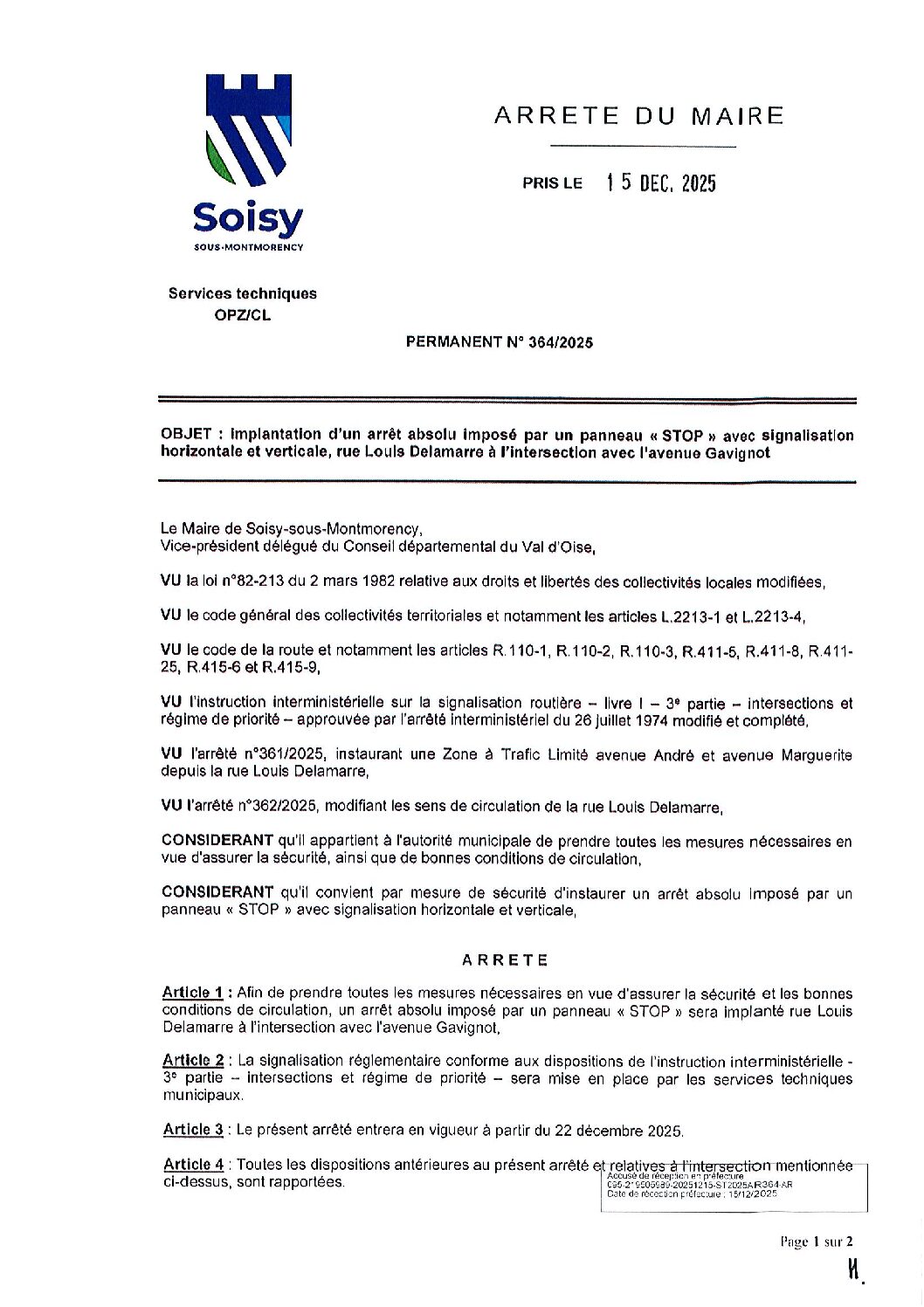 Arrêté 364/2025 : Implantation d'un arrêt absolu imposé par un panneau « STOP » avec signalisation horizontale et verticale, rue Louis Delamarre à l'intersection avec l'avenue Gavignot