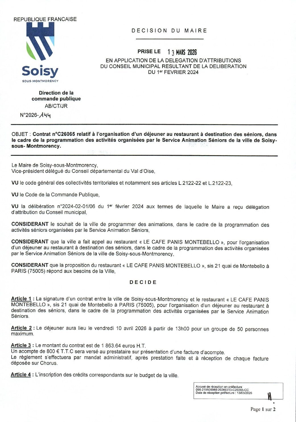 Décision 2026-144 : Contrat n°C26065 relatif à l'organisation d'un déjeuner au restaurant à destination des séniors, dans le cadre de la programmation des activités organisées par le Service Animation Séniors de la ville de Soisy-sous-Montmorency