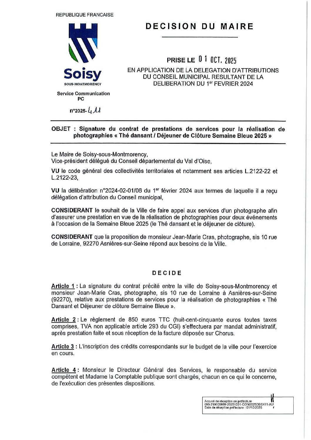 Décision 2025-411 : Signature du contrat de prestations de services pour la réalisation de photographies "Thé dansant/Déjeuner de Clôture Semaine Bleue 2025"