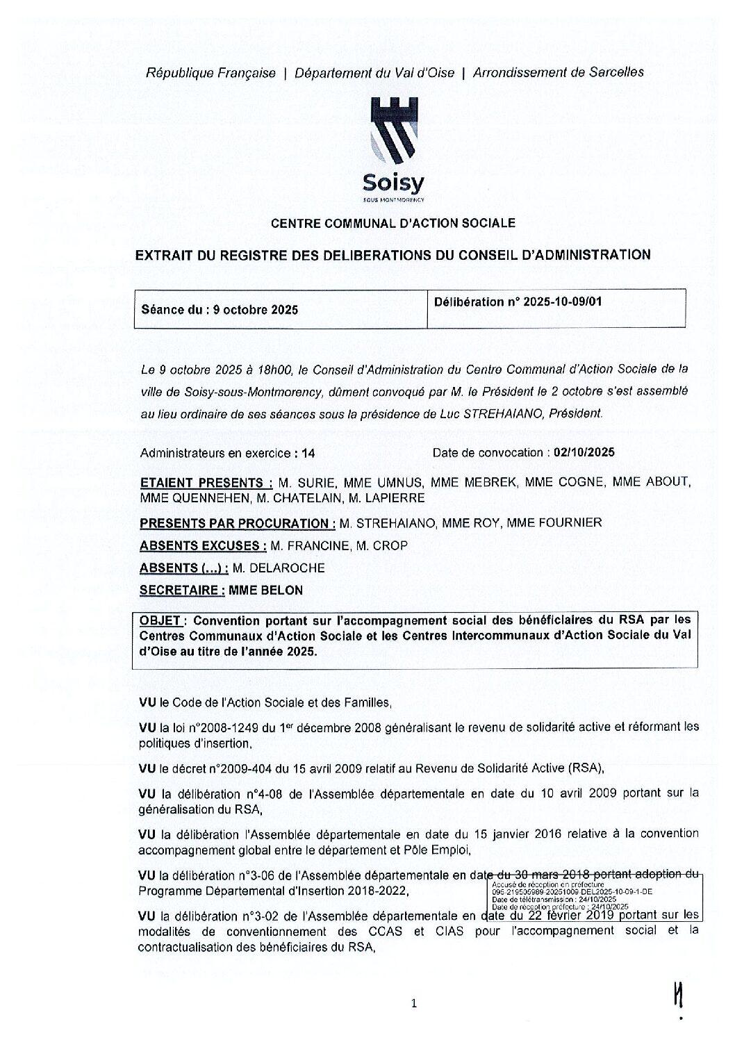 Délibération n° 2025-10-09/01 : Convention portant sur l'accompagnement social des bénéficiaires du RSA par les Centres Communaux d'Action Sociale et les Centres Intercommunaux d'Action Sociale du Val d'Oise au titre de l'année 2025