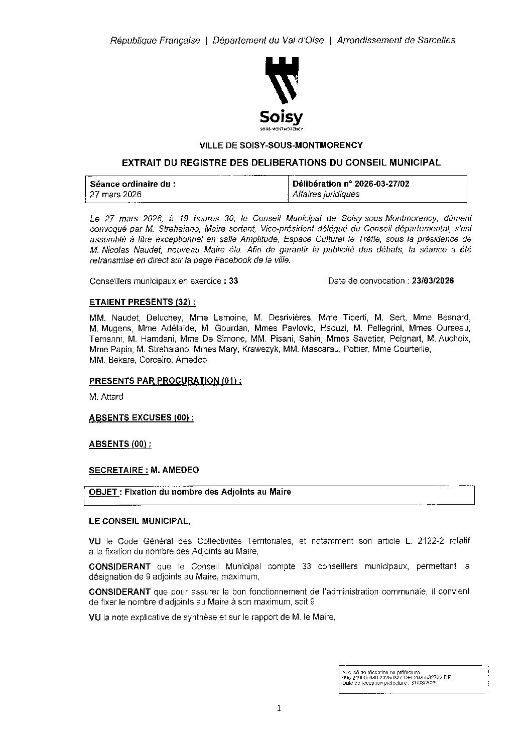Délibération 2026-03-27/02 : Fixation du nombre des Adjoints au Maire