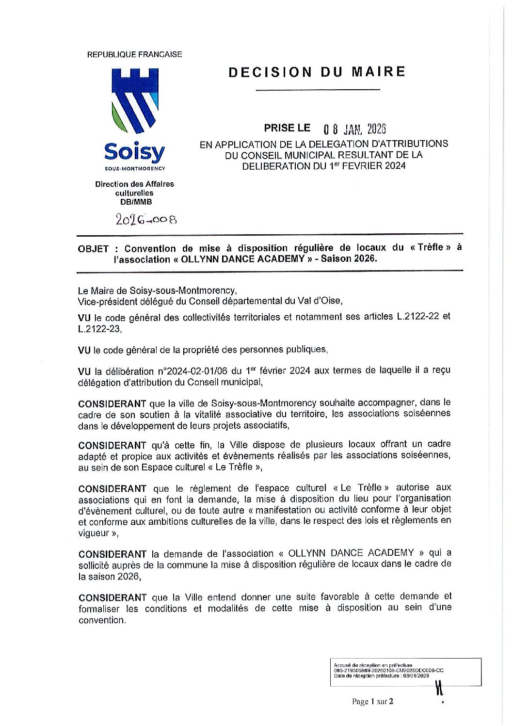 Décision 2026 – 008 : Convention de mise à disposition régulière de locaux du « Trèfle » à l'association « OLL YNN DANCE ACADEMY » – Saison 2026