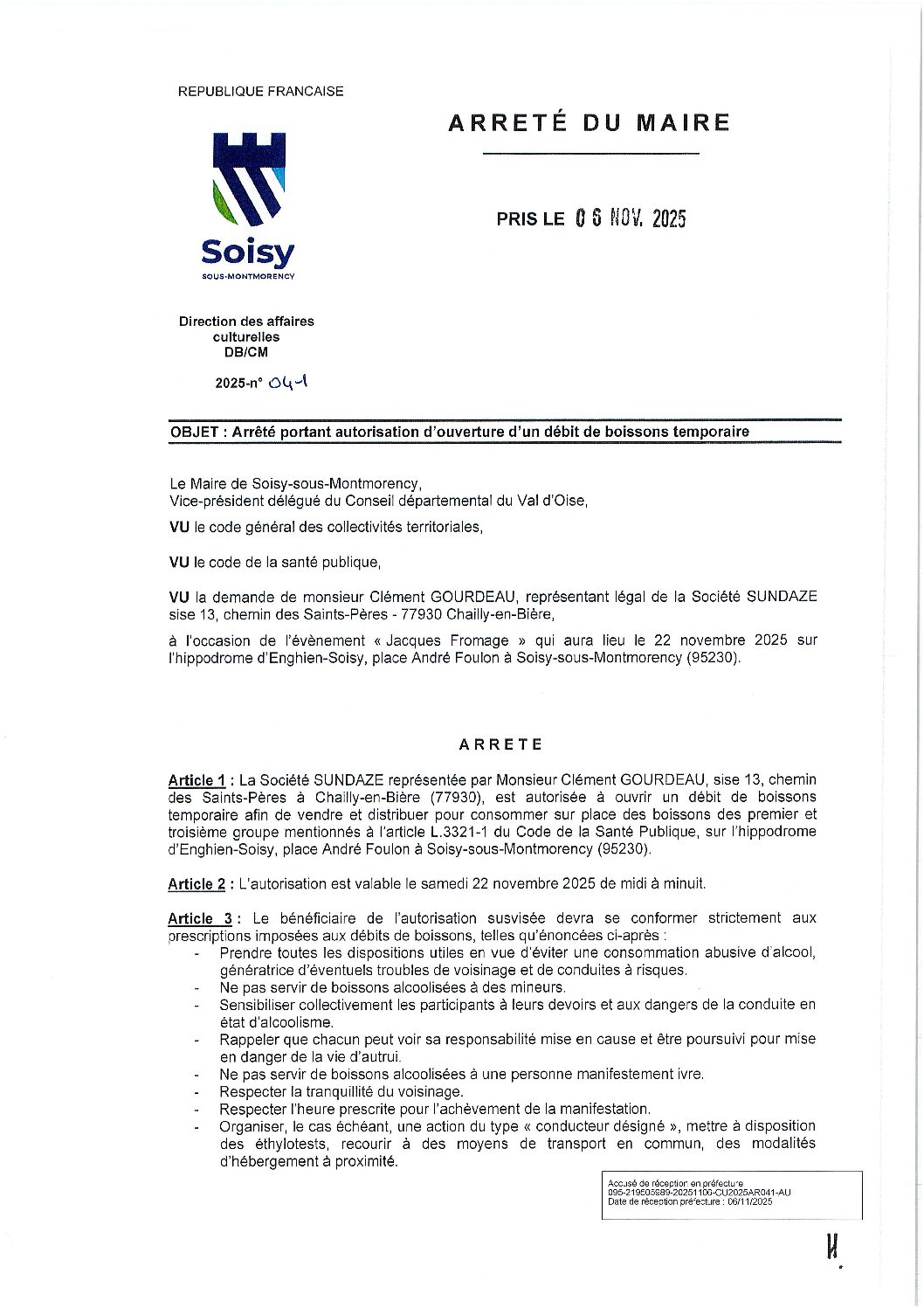 Arrêté 2025-041 : Arrêté portant autorisation d'ouverture d'un débit de boissons temporaire