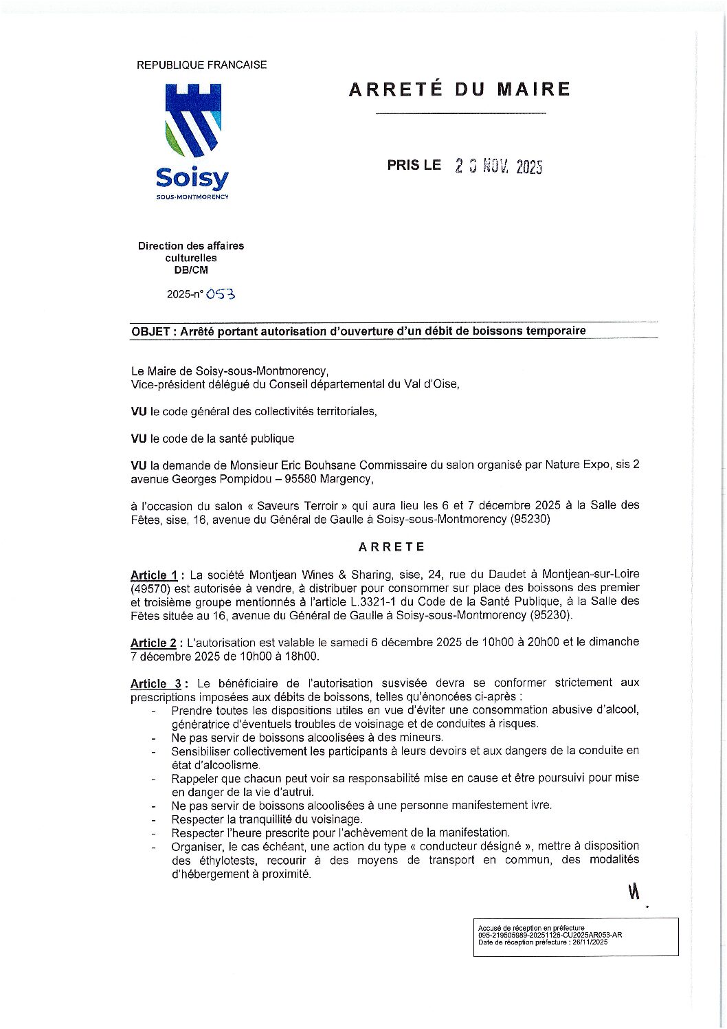 Arrêté 2025-053 : Arrêté portant autorisation d'ouverture d'un débit de boissons temporaire