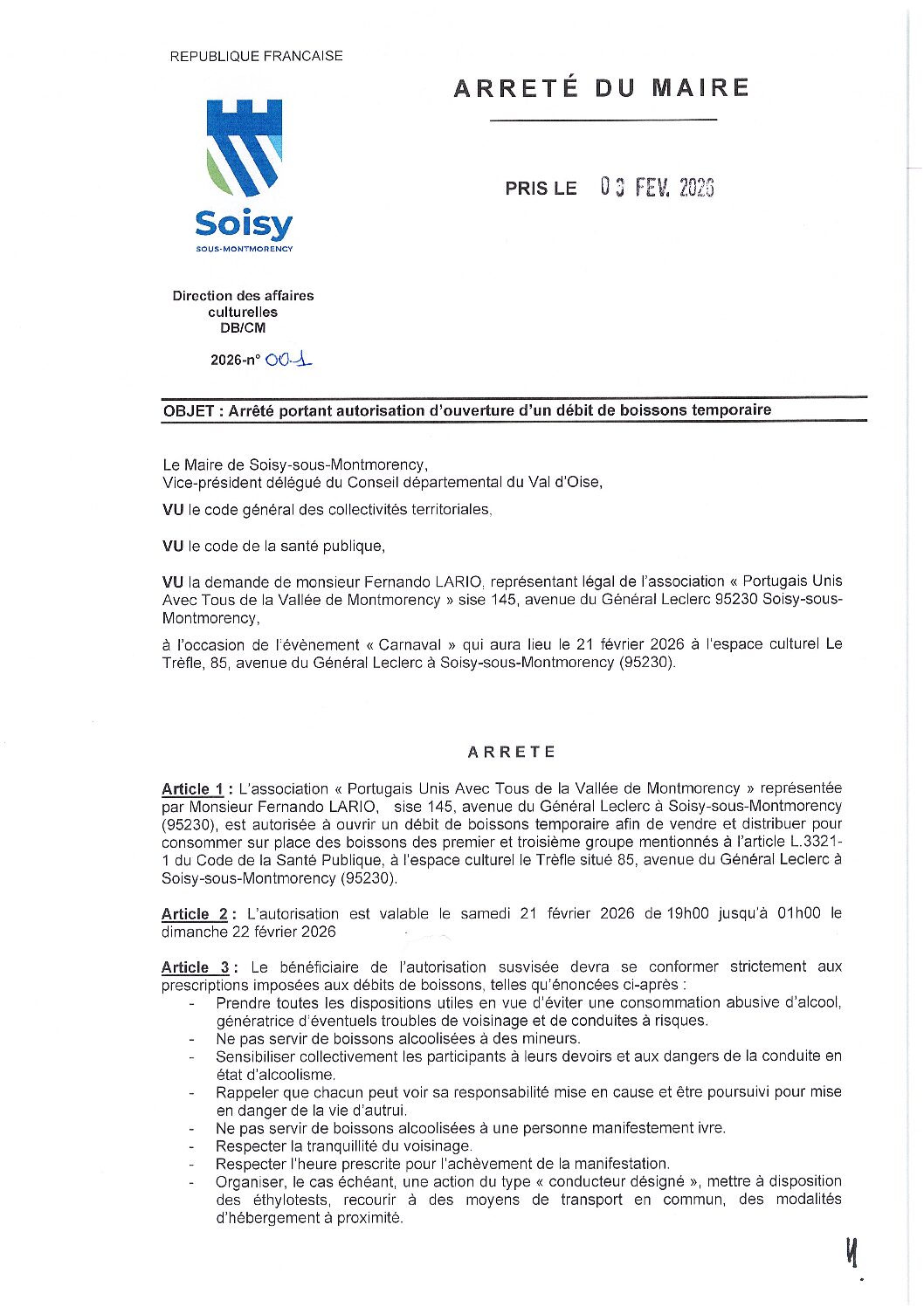 Arrêté 2026-001 : Arrêté portant autorisation d'ouverture d'un débit de boissons temporaire