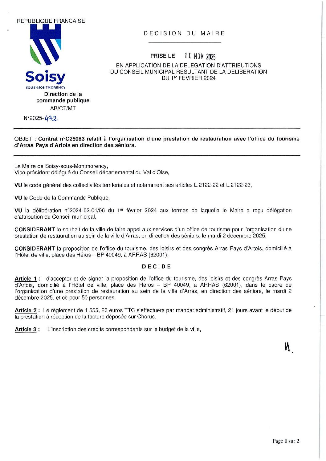 Décision 2025-472 : Contrat n°C25083 relatif à l'organisation d'une prestation de restauration avec l'office du tourisme d'Arras Pays d'Artois en direction des séniors.