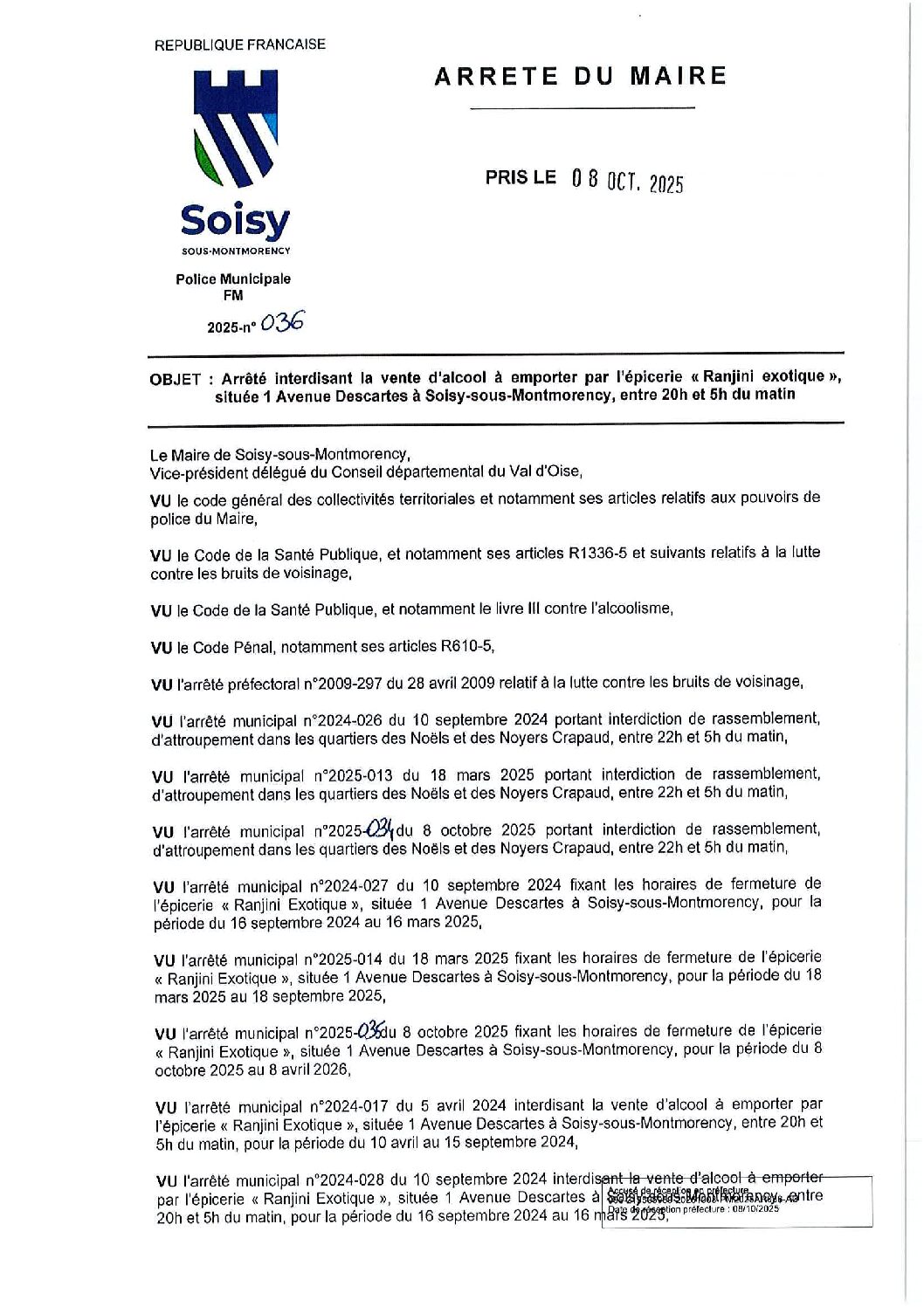 Arrêté 2025-036 : Arrêté interdisant la vente d'alcool à emporter par l'épicerie « Ranjini exotique », située 1 Avenue Descartes à Soisy-sous-Montmorency, entre 20h et 5h du matin