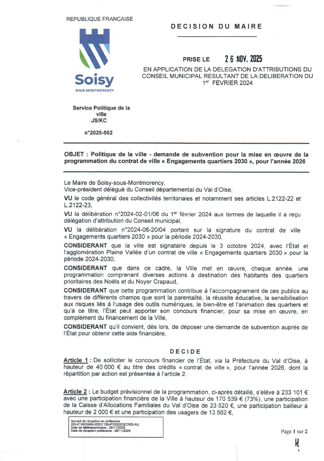 Décision 2025-502 : Politique de la ville – demande de subvention pour la mise en oeuvre de la programmation du contrat de ville "Engagements quartiers 2030", pour l'année 2026