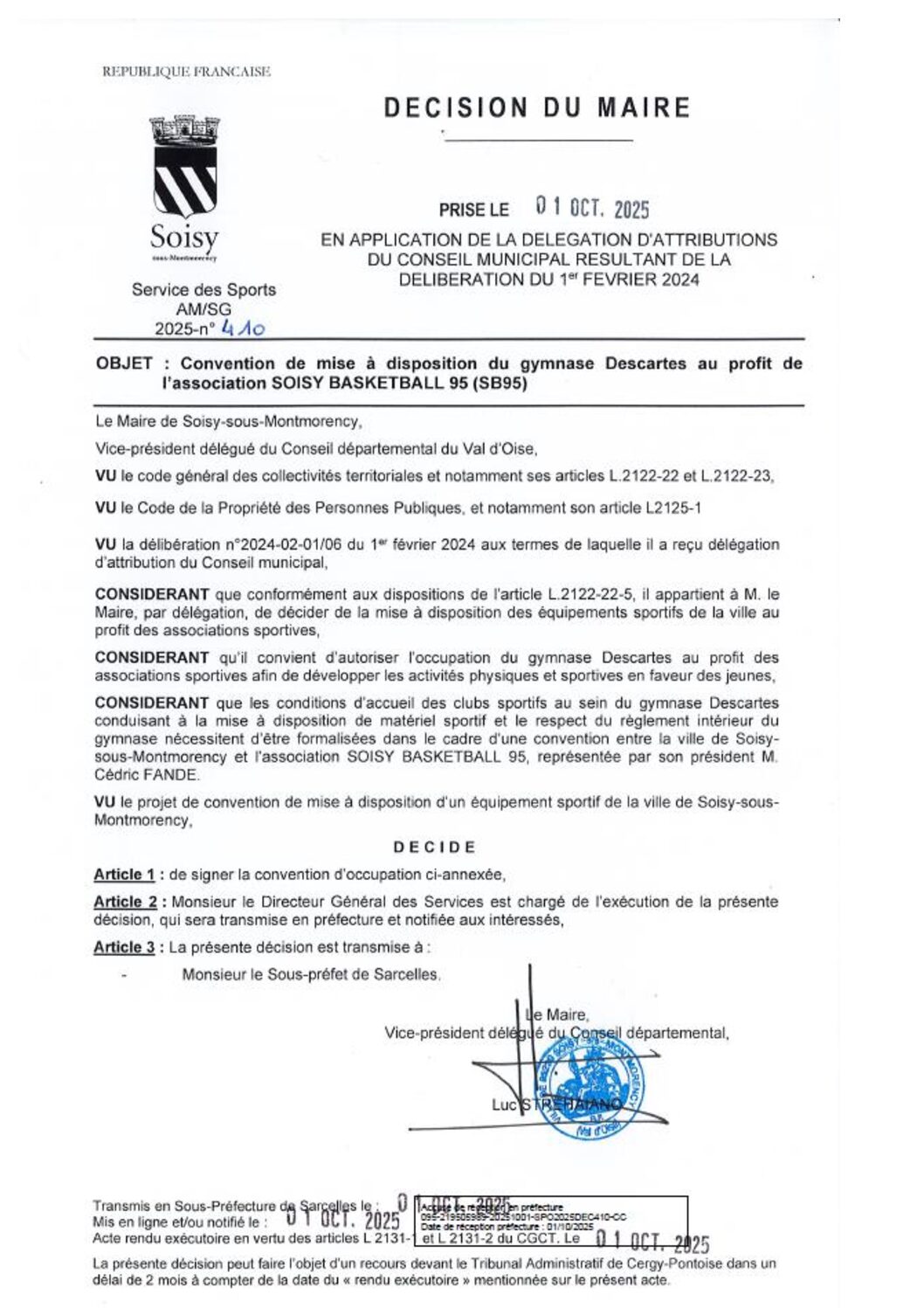 Décision 2025-410 : Convention de mise à disposition du gymnase Descartes au profit de l'association Soisy Basketball 95 (SB95)