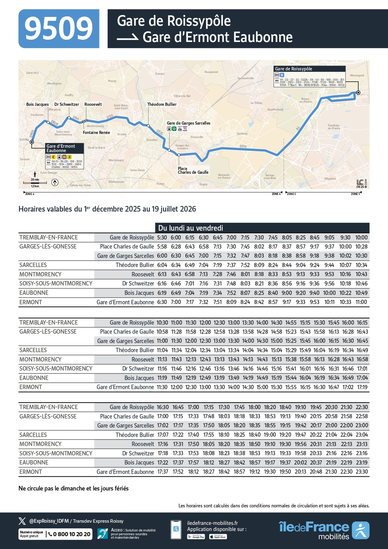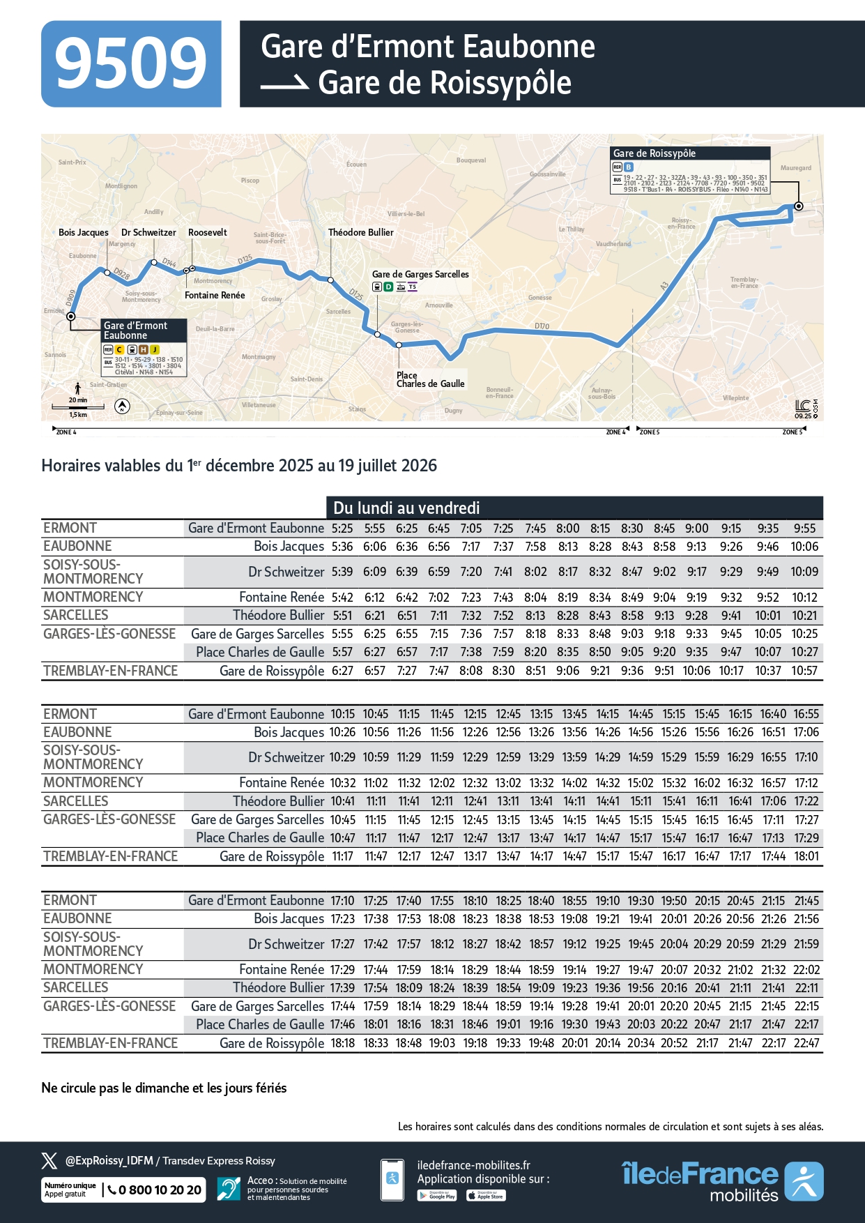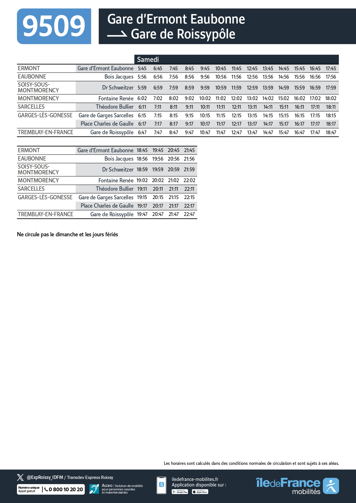 Nommée 9509, elle relie la gare d’Ermont-Eaubonne à l’aéroport de Roissy Charles de Gaulle en passant par Soisy-sous-Montmorency. En effet, l’arrêt est celui du Docteur Schweitzer, situé sur la D144, face au complexe sportif.