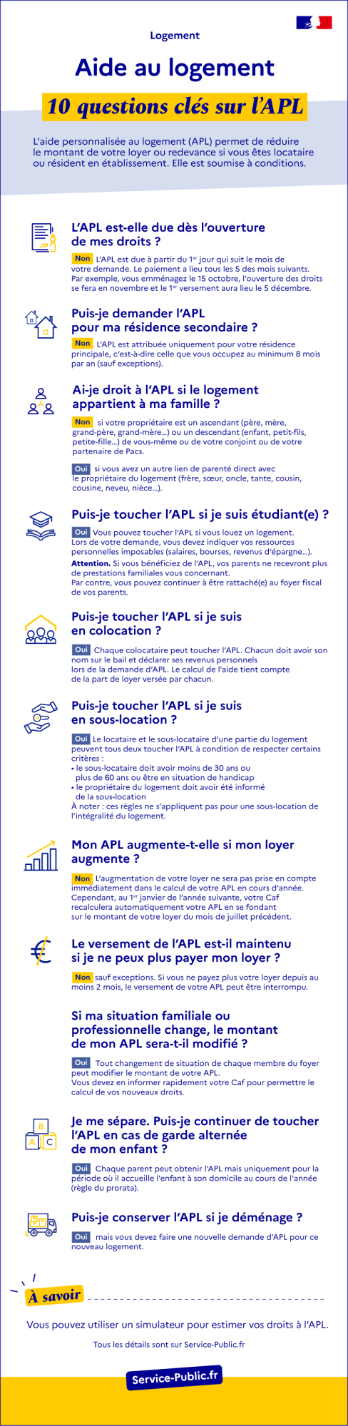 Attention : si vous bénéficiez de l’APL, vos parents ne recevront plus de prestations familiales vous concernant. Par contre, vous pouvez continuer à être rattaché(e) au foyer fiscal de vos parents.